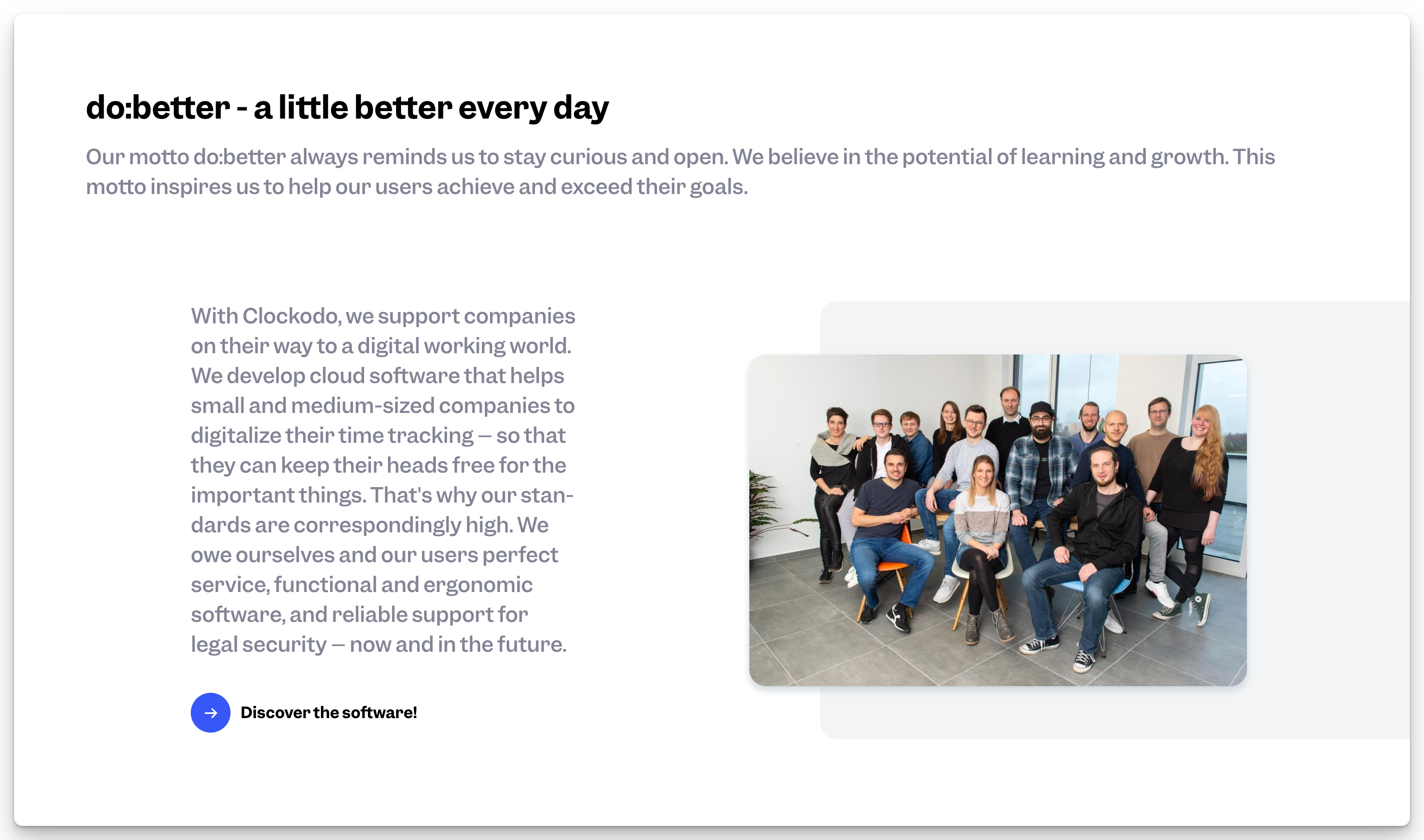 Clockodo’s marketing is based on three pillars: SEO, Google Ads, and referrals. “We paid attention to that from the very beginning,” Moritz says about search engine optimization. Even the first website was SEO-optimized – an advantage that has built up over 13 years.