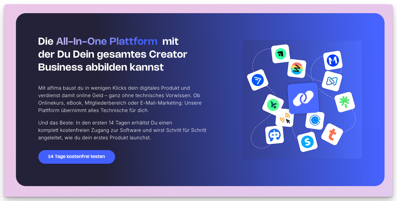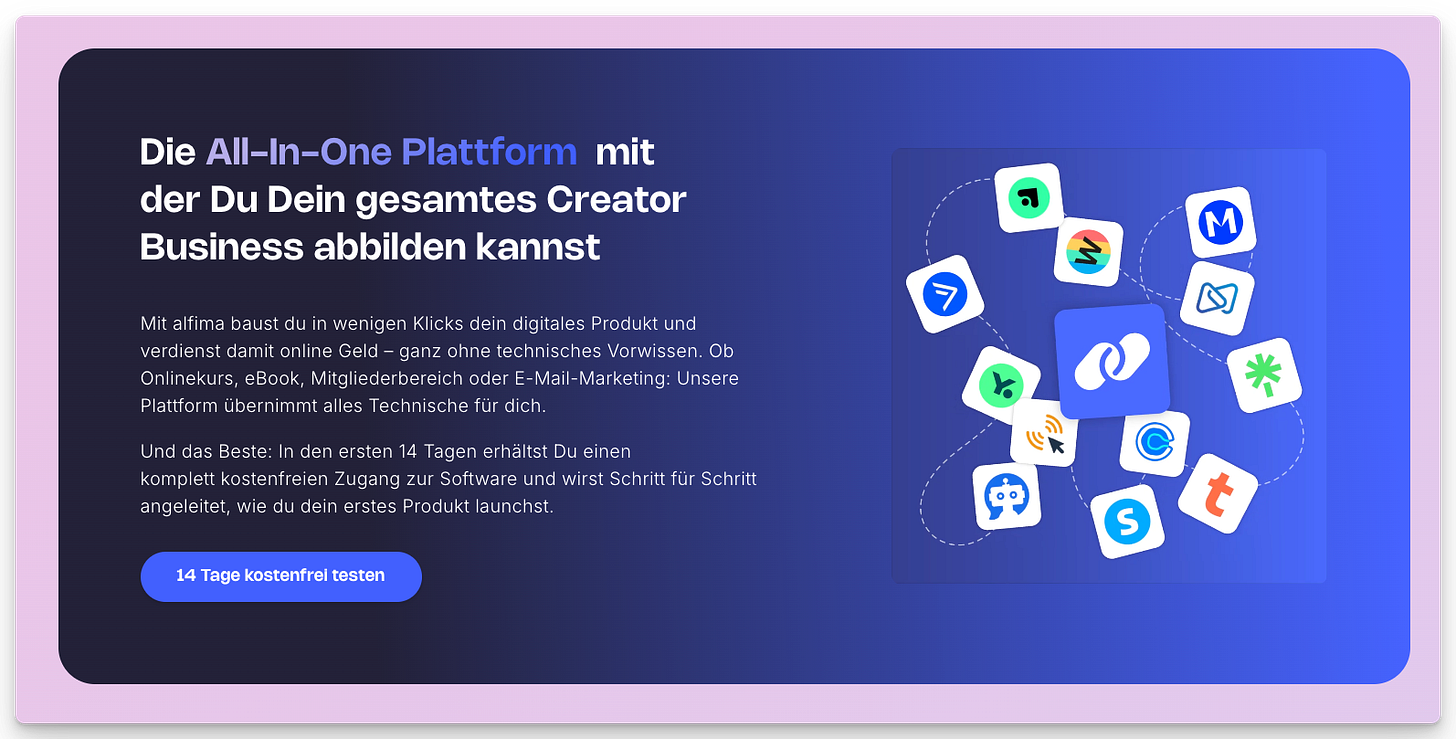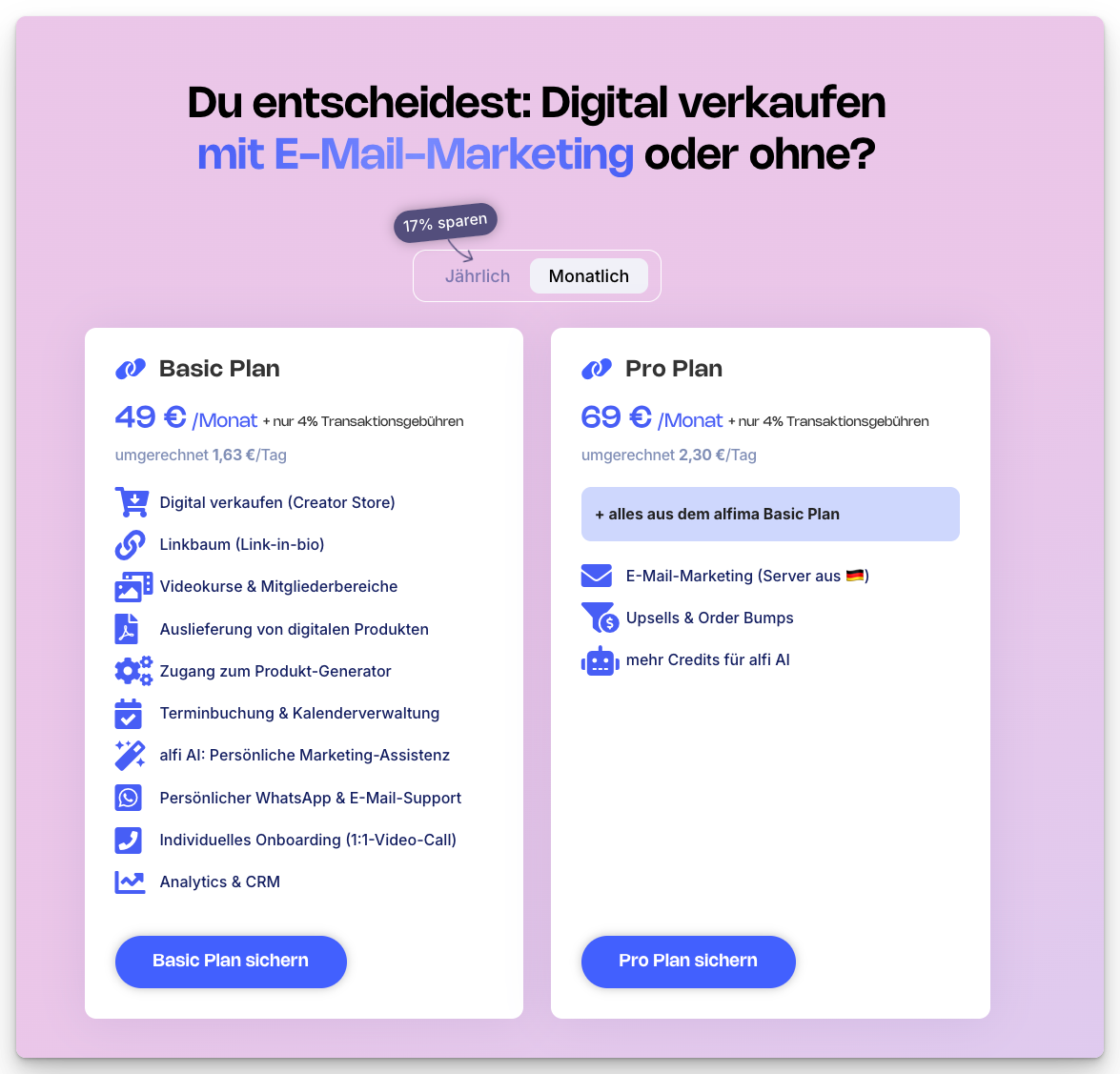 alfima combines everything creators need for their digital business: link-in-bio page, membership area for online courses, payment processor with just 4% transaction fees, landing page builder, calendar tool, and email marketing. “When you’re starting out, you need different software tools that you have to connect, pay for each one, learn each one. That’s bullshit,” Alexander sums up the problem.