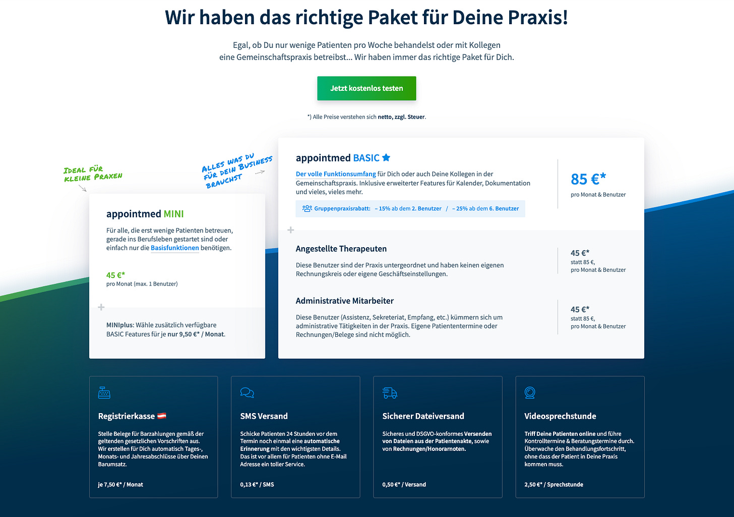 appointmed offers complete practice management: appointment calendar, patient records, treatment documentation, billing, online booking, and video consultation. Pricing starts at 45 euros/month (Mini package) and 85 euros/month (Basic package).