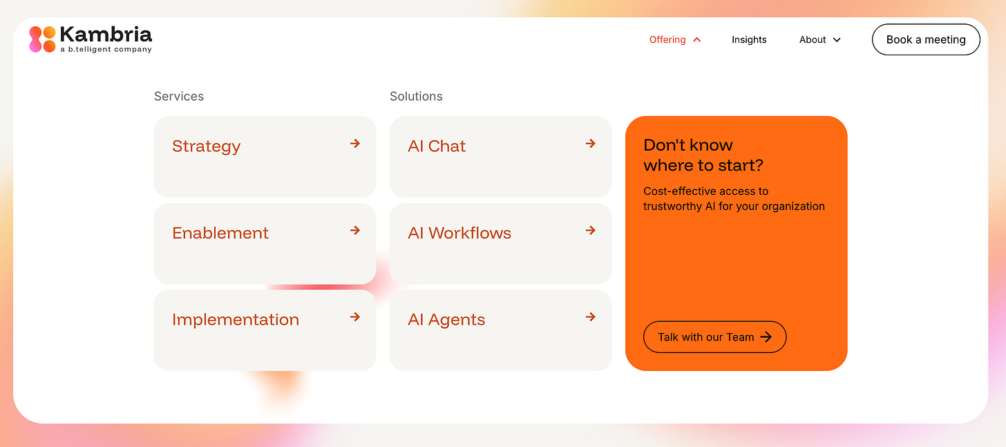 Kambria is part of the b.telligent group and positions itself as a full-service partner for AI transformation in the German Mittelstand. In practice, that means three things: giving organizations broad access to AI tools, training people to actually use them, and identifying processes that can be meaningfully improved with AI.