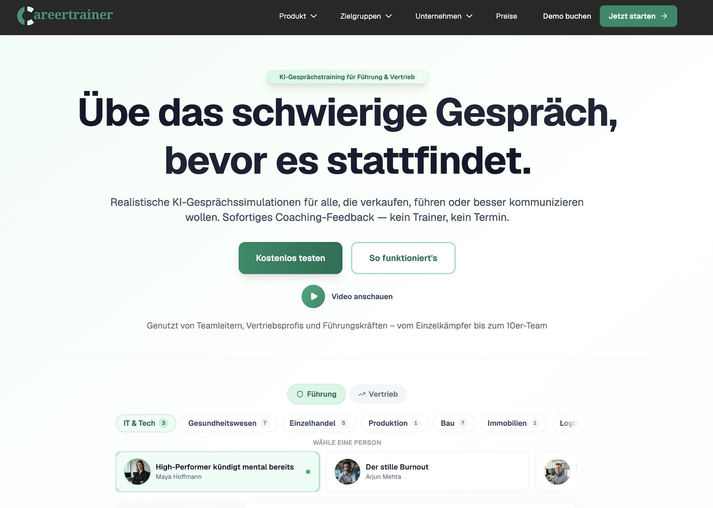 In parallel, Jannik and his second co-founder Markus are building careertrainer.ai – an audio-based platform for AI role-plays. Managers practice difficult feedback conversations. Sales reps rehearse cold calls. A separate LLM evaluates at the end how well the defined conversation goals were met.