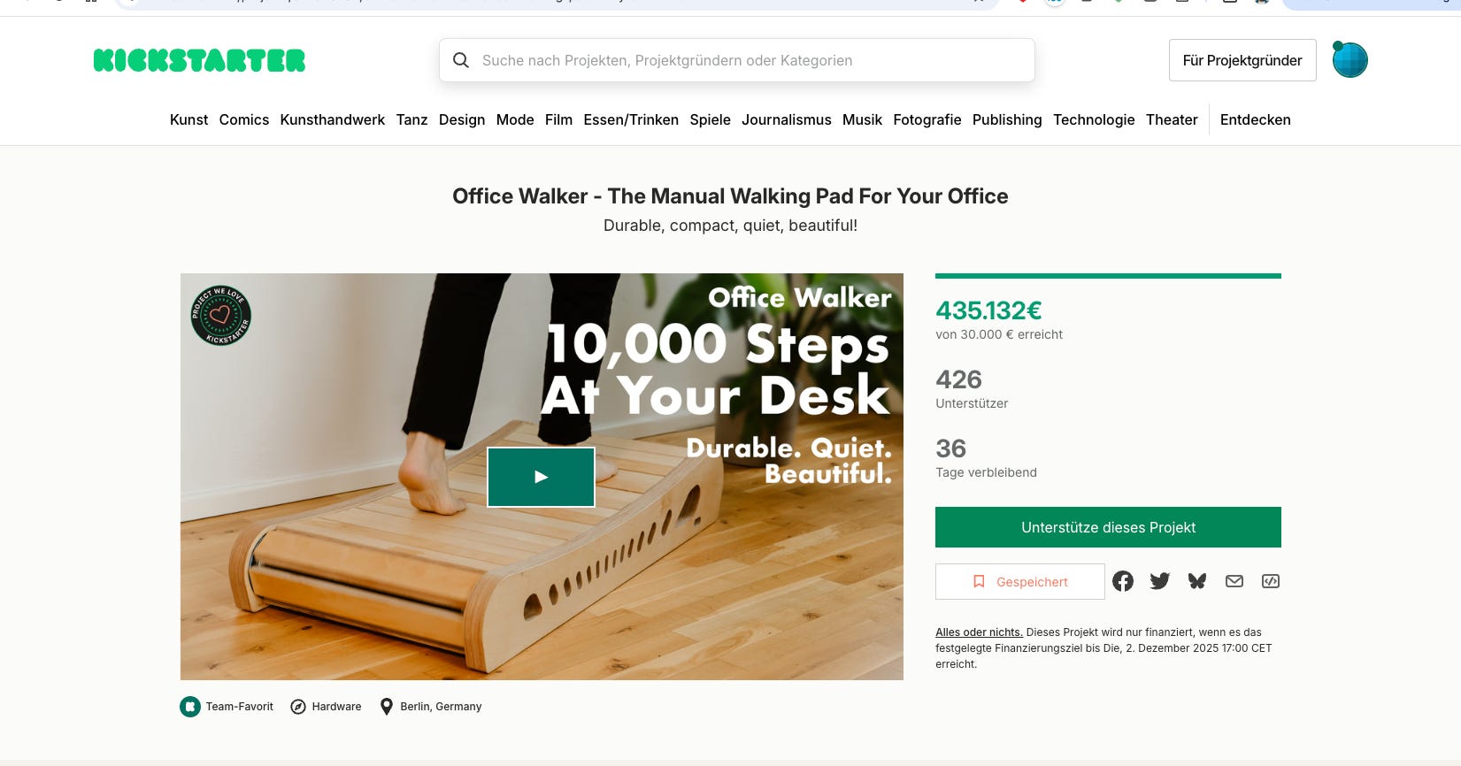 His solution: Walking pads. But after three defective electric treadmills in two years and €1,000 in losses, the physicist and software developer is now developing his own mechanical walking pad – the Office Walker. His Kickstarter campaign is already a success: Over €400,000 has been raised so far.