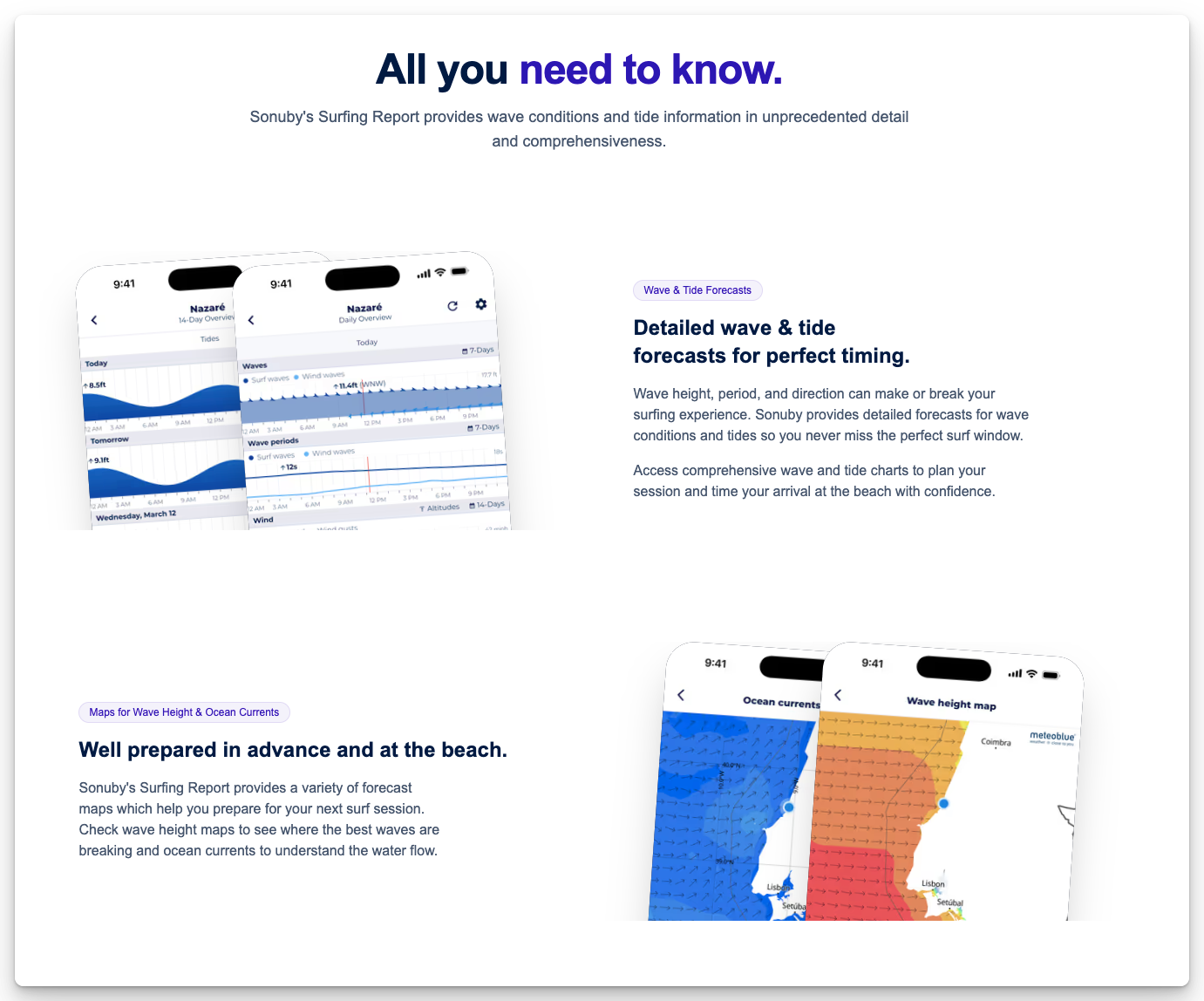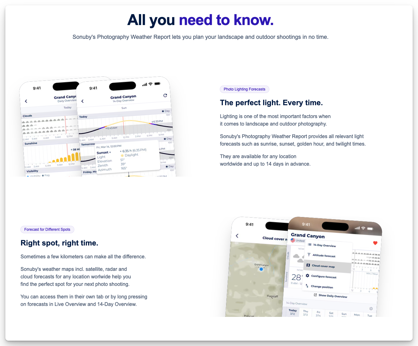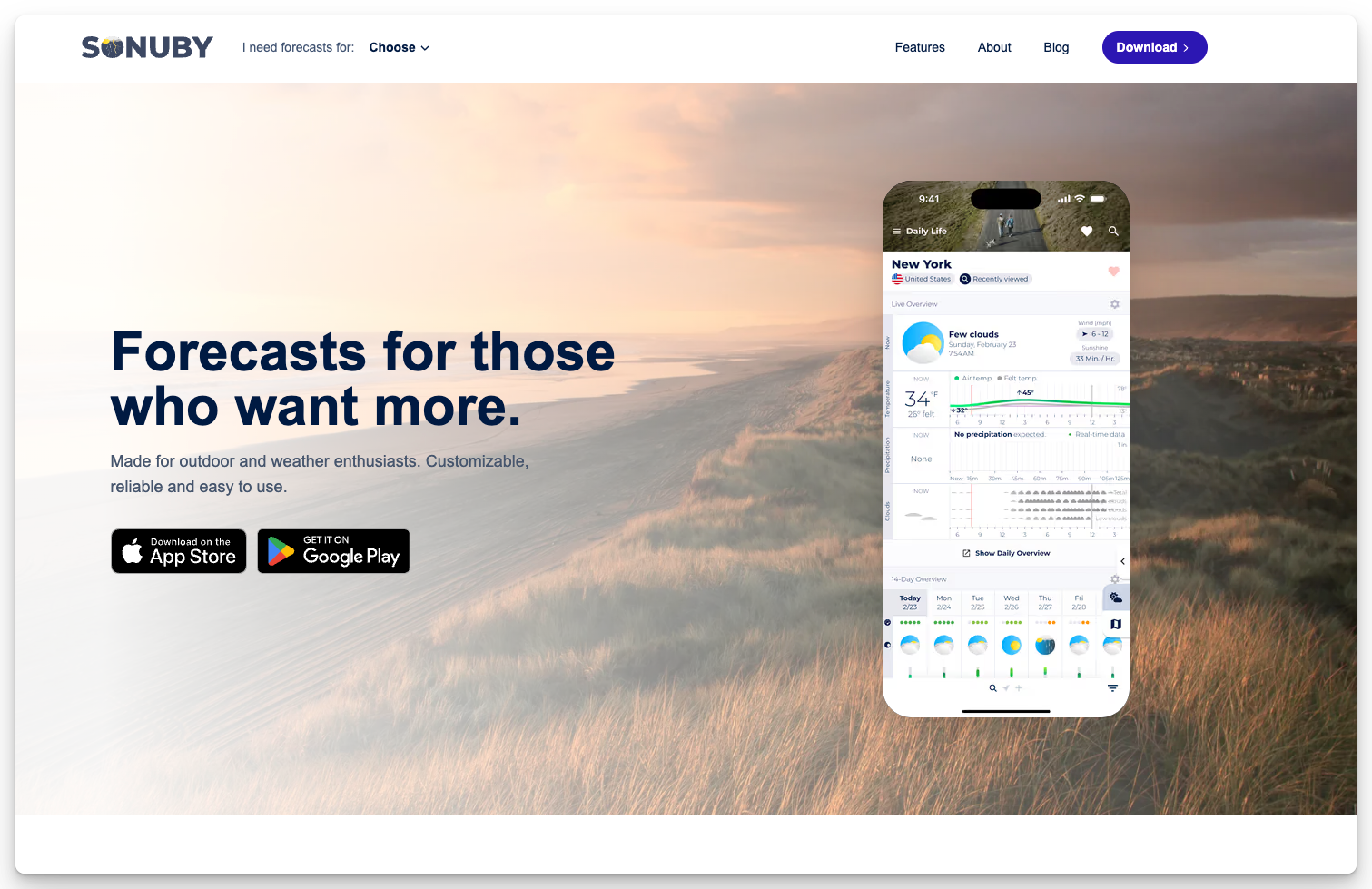 Sonuby is a customizable weather app for people who need more than temperature and precipitation. Sailors need wind forecasts across entire areas, skydivers need different cloud heights, photographers need the exact golden hour with cloud coverage. “My goal is to create an app that adapts to the user,” Julian explains.