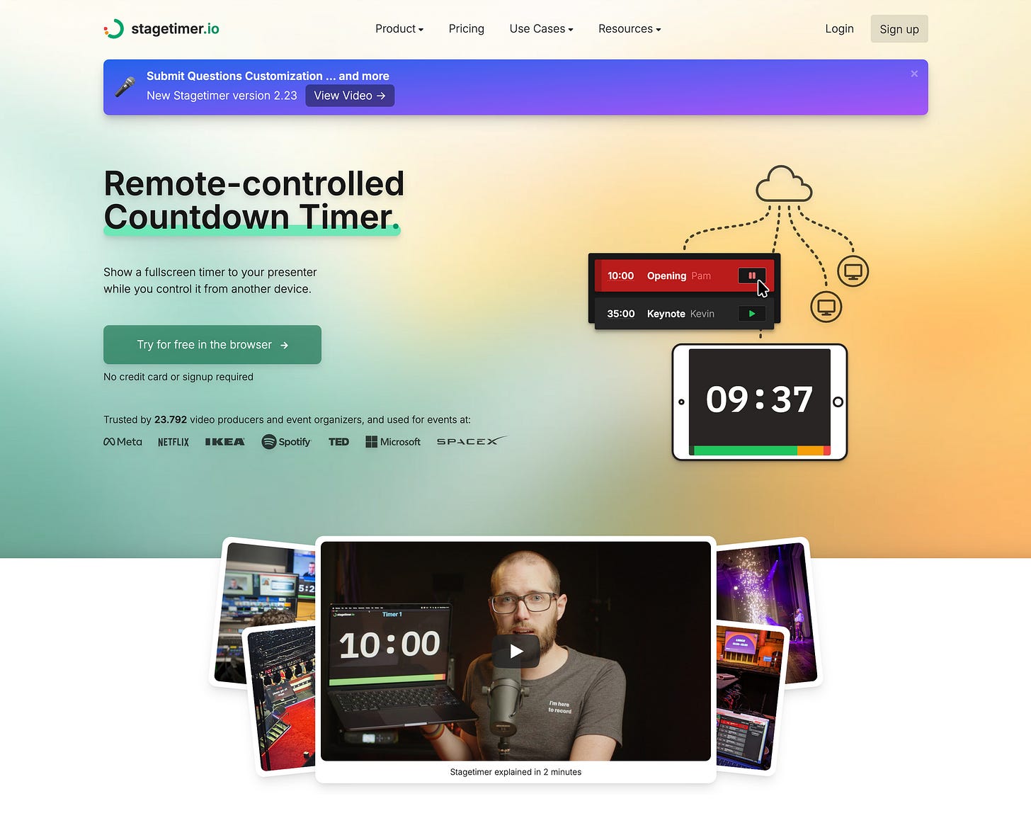 stagetimer shows speakers at events their remaining time. What sounds simple is now used by 2,000 paying customers – from SpaceX to universities for exams.