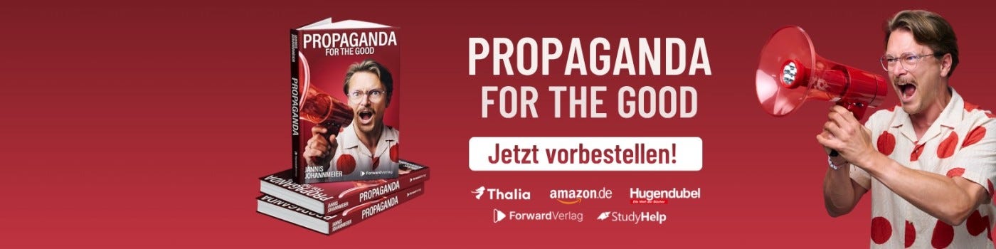 The key: self-application. “Most communications agencies don’t live the stuff they preach. We do.” Jannis knows what a critical portrait in Manager Magazin feels like. He wrote a book – “Propaganda for the Good.”
